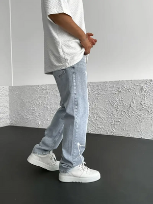 Relaxed-fit jeans in light blue denim. Lightning-effect print detailing on front. Five-pocket design. Zip fly and top button fastening. Comfortable fit with straight leg.